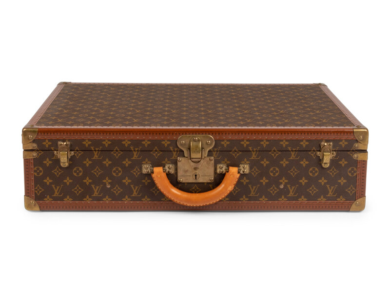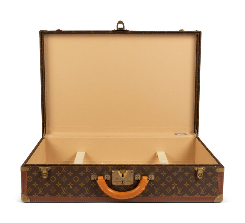 Louis Vuitton Monogram Alzer 60 hard-sided suitcase with top rolled padded leather handle and monogrammed brass lock plate with latch closures. Removable tray with monogrammed ties.