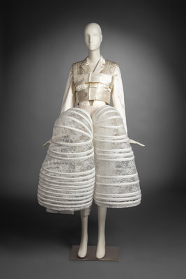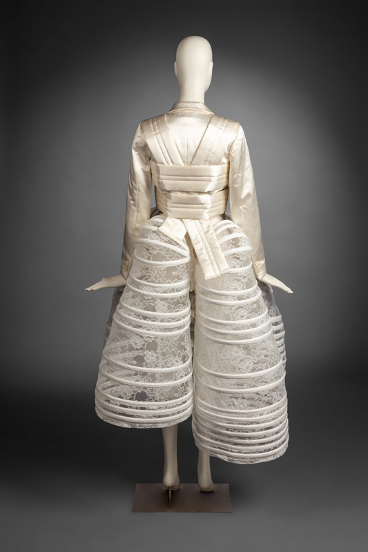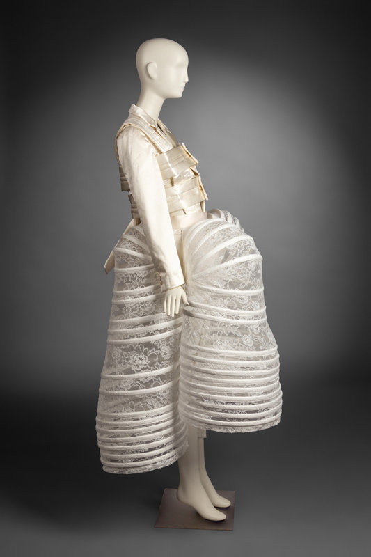 Structured, conceptual, crinoline-inspired skirt in ivory satin and sheer lace with four, tubular pieces.