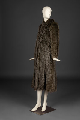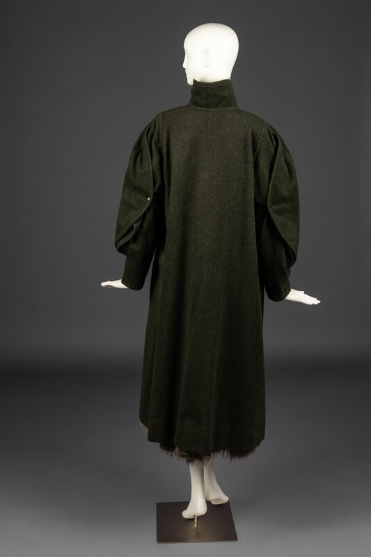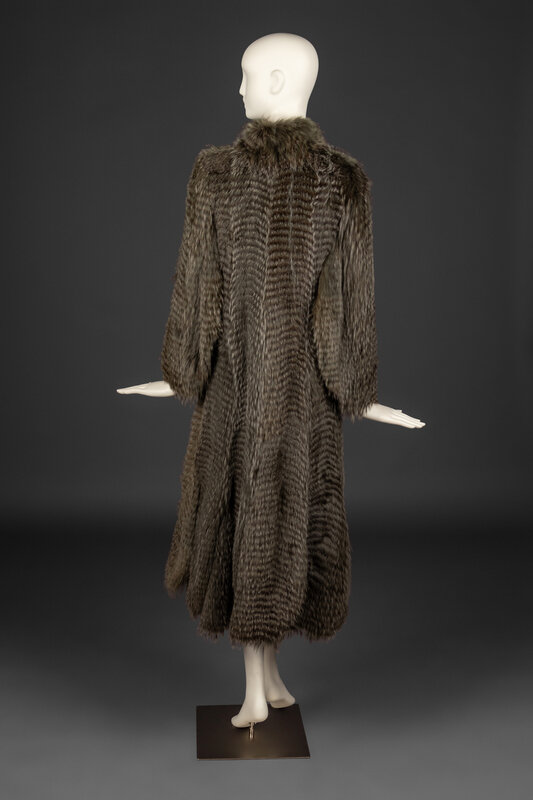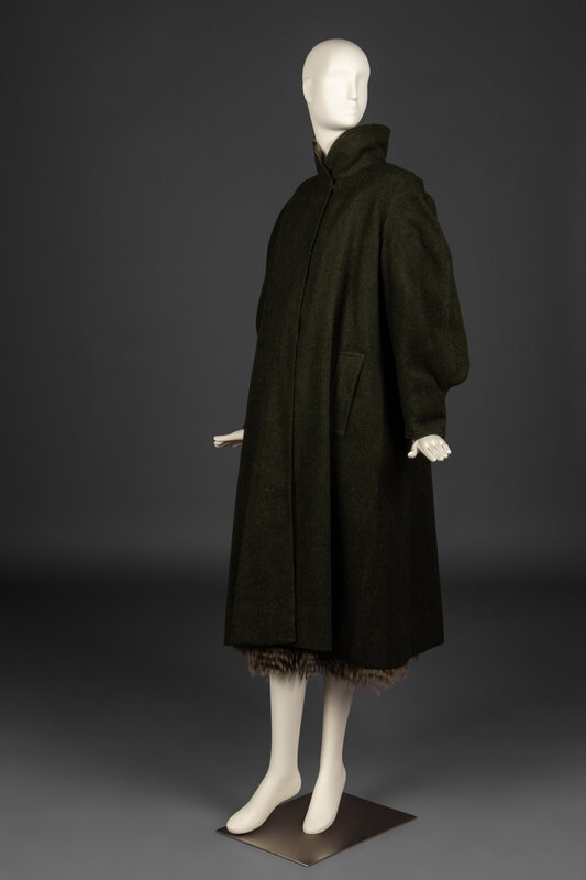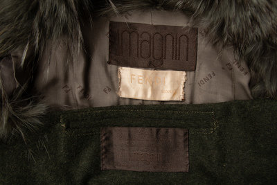 Horizontal-cut fox fur coat with short, stand collar and olive green melton wool overcoat. Fur coat features hook/eye closures and printed lining. Finished with Tiffany & Co. engraved nameplate in the interior of the coat.