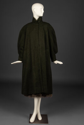 Olive green melton wool overcoat with snap-front closure. Unlined.