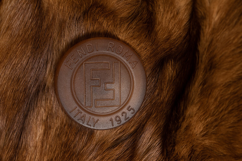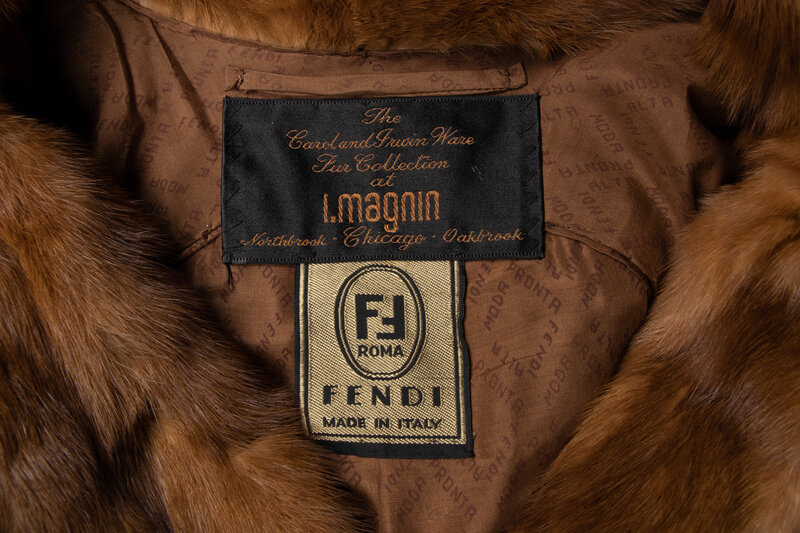 A-line oversized fur coat in light pastel brown. Features locking closures at center front, shirt collar, raglan-style sleeves, and full logo lining.Label: Fendi