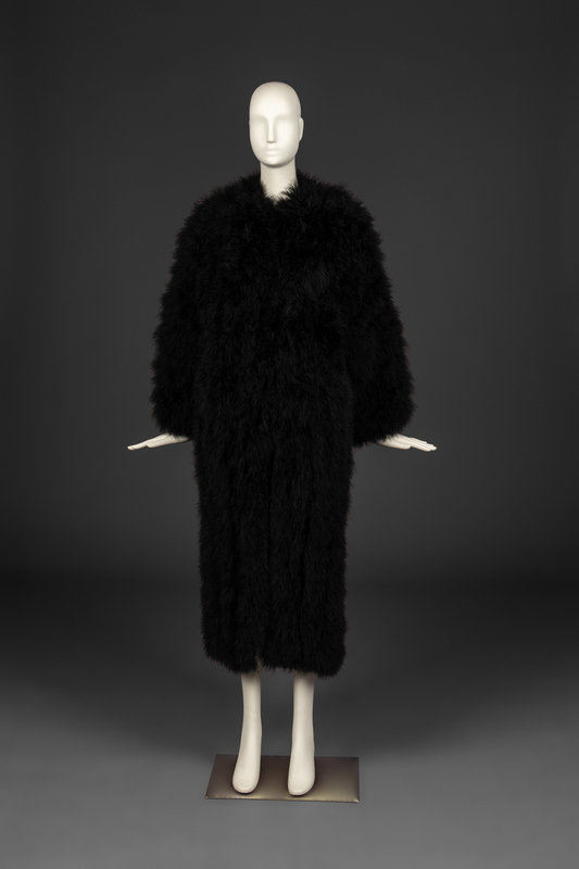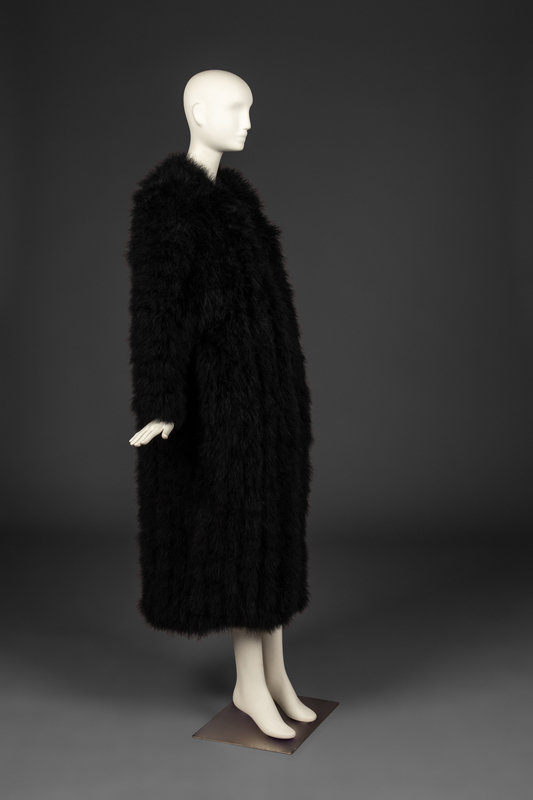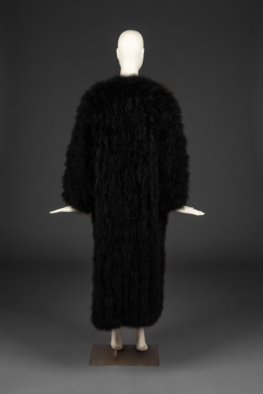 Black, collarless marabou feather coat. Hook closure at neckline and full lining.