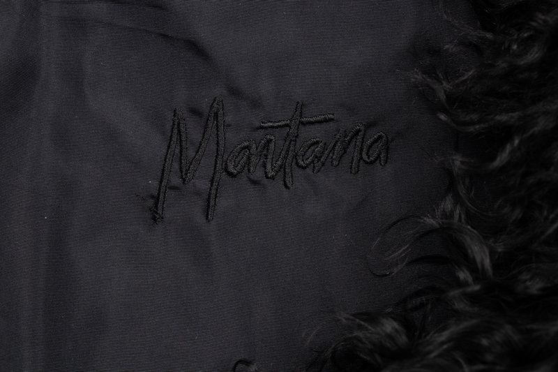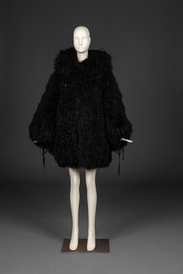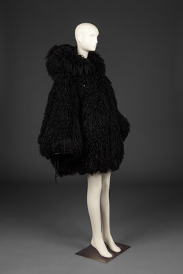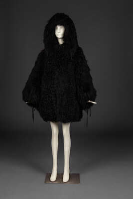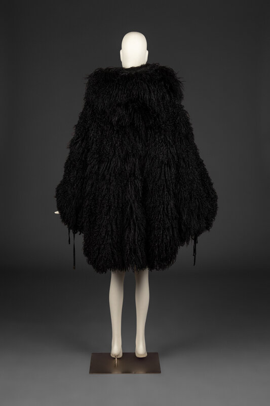 Oversized, hooded, black Mongolian lamb fur jacket with drawstring closures at hood, cuffs, and bottom hem. Fully-lined. Part of Claude Montana's Fall-Winter 1992 Collection.