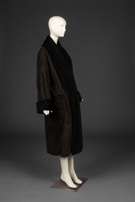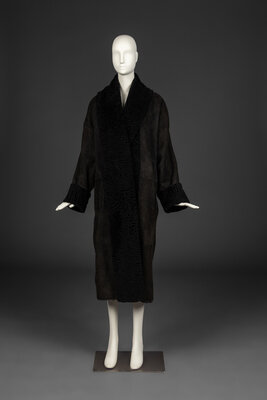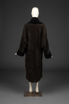 Black oversized tuxedo collar shearling coat with drop sleeves. Unlined with two slash hip pockets.