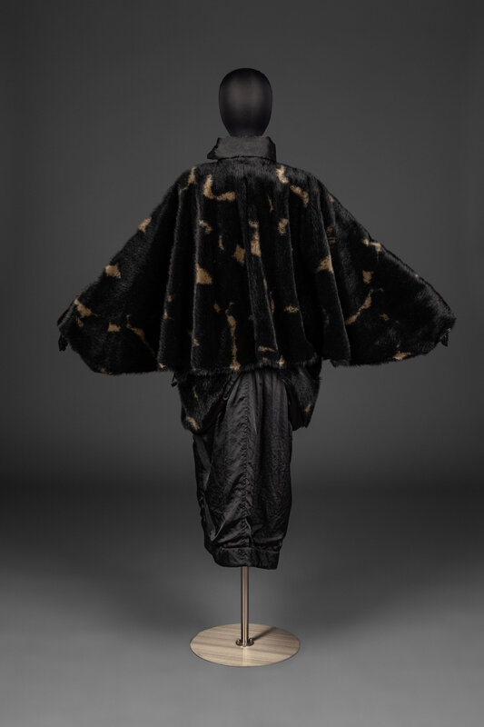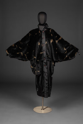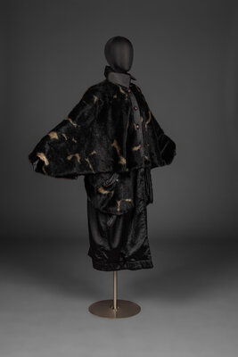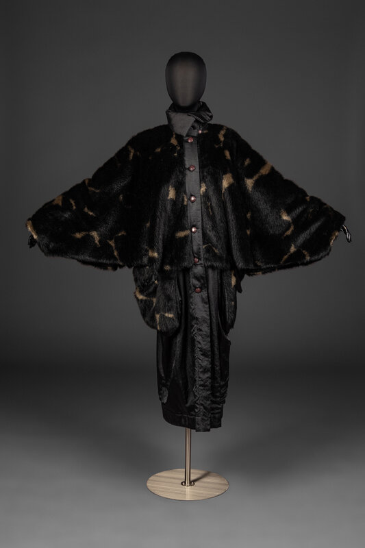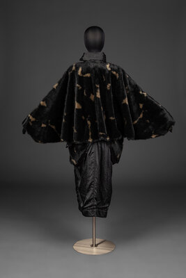 Oversized, dolman-sleeve jacket in padded, faux fur and shiny poly satin. Jacket features a button closure, side pockets, and a spread collar.