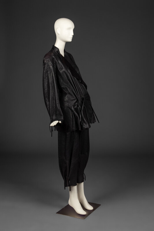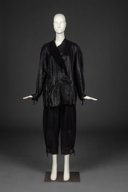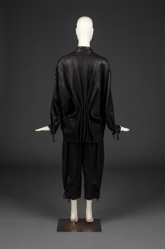 The inimitable, sculptural creations of Issey Miyake (1938-2022) bridge the gap between the gallery, runway, and street. Born and raised in Hiroshima, Miyake survived the atomic bombing at age 7 with a permanent limp, and soon after lost his mother to radiation poisoning. He became an advocate for nuclear disarmament in his later life. From a young age, Miyake was drawn to create and believed strongly in the interconnectedness of the arts. As far back as 1960, Miyake campaigned that clothing deserves appreciation for its design in the same way as architecture or furniture. After graduating from Tokyo’s Tama Art University in 1964 with a degree in graphic design, Miyake worked in Paris and New York under designers including Hubert de Givenchy and Geoffrey Beene. In 1971, he founded his eponymous design studio. Almost immediately, Miyake was lauded as a luminary. His work was soon everywhere from the cover of Artforum to the dancers of the Frankfurt Ballet.