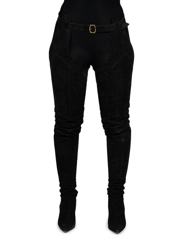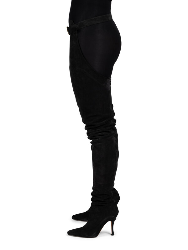 Rare Manolo Blahnik chap boots in black suede with 105-mm stiletto heel and belt.