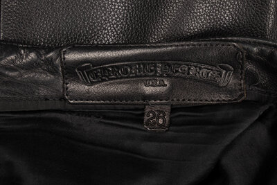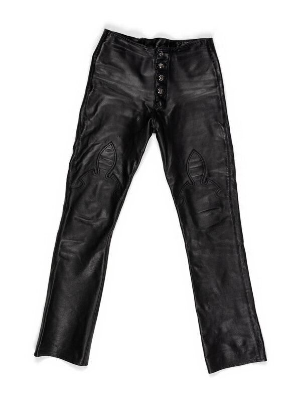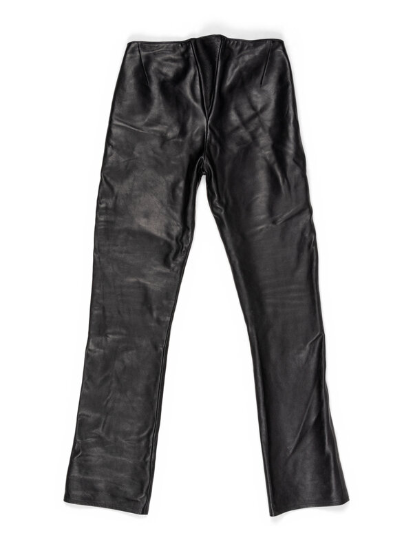Button-fly, waistless pant in black calfskin leather with decorative overlays at knees. Sterling silver button. Partially-lined. One small pocket inside waistband.