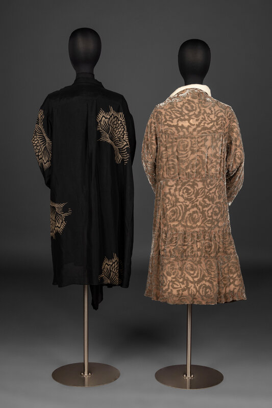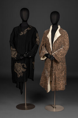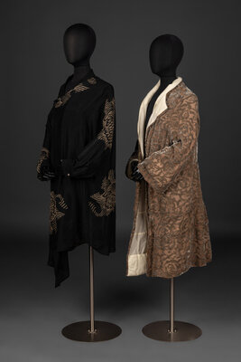 Long, oversized, robe-style jacket with asymmetrical closure in printed black moire fabric with button and hook/loop closures. Unlined.
