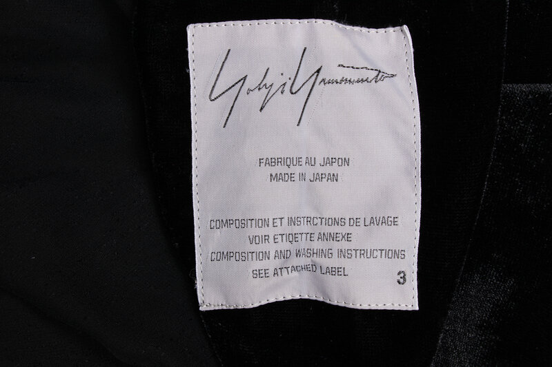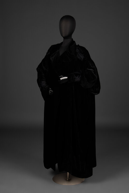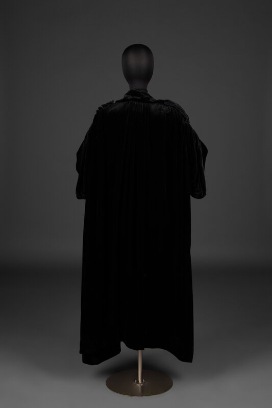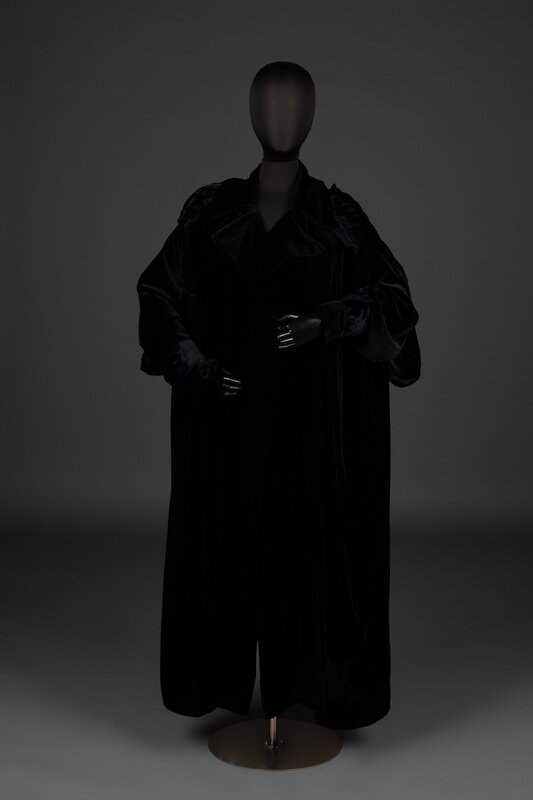 Long, oversized, robe-style jacket in black velvet with notch collar, decorative epaulettes, underarm sleeve extensions, and banded cuffs Unlined.