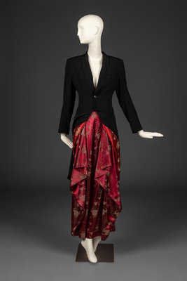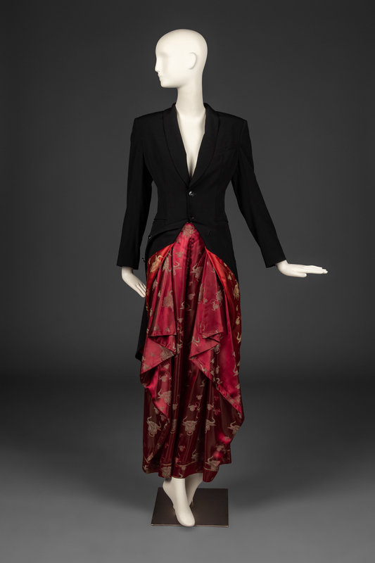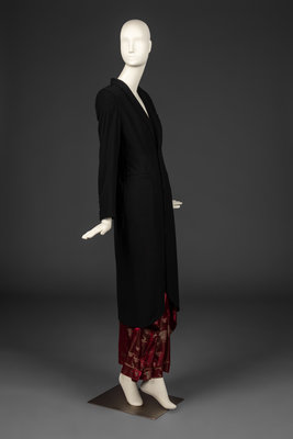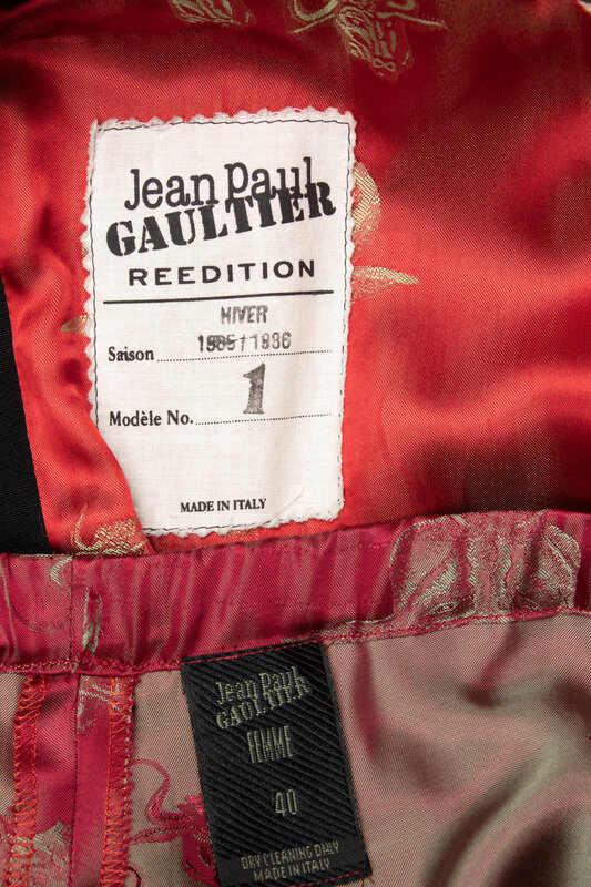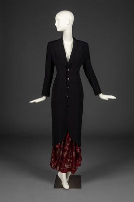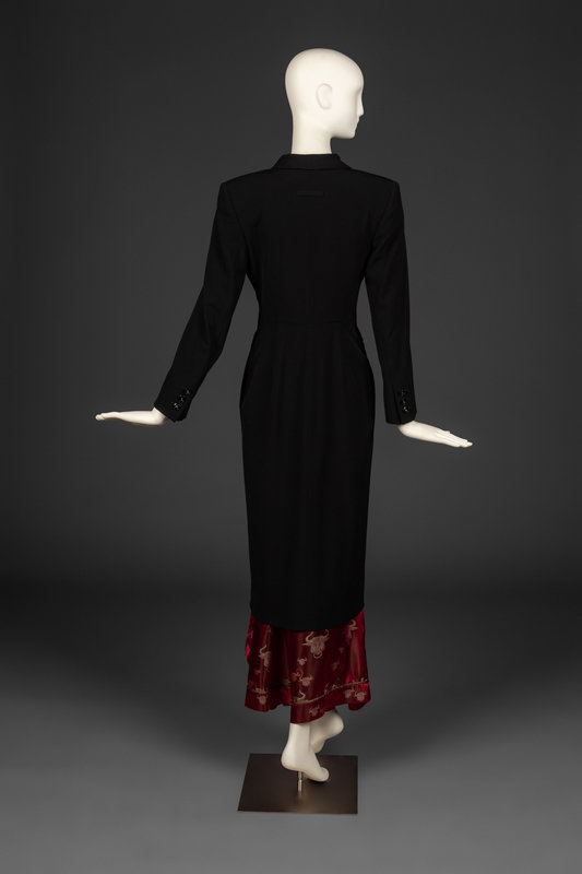 Single-breasted, shawl-collar long jacket in black wool. Fully-lined in red/gold jacquard. Re-edition piece from the Fall-Winter 1985 collection.