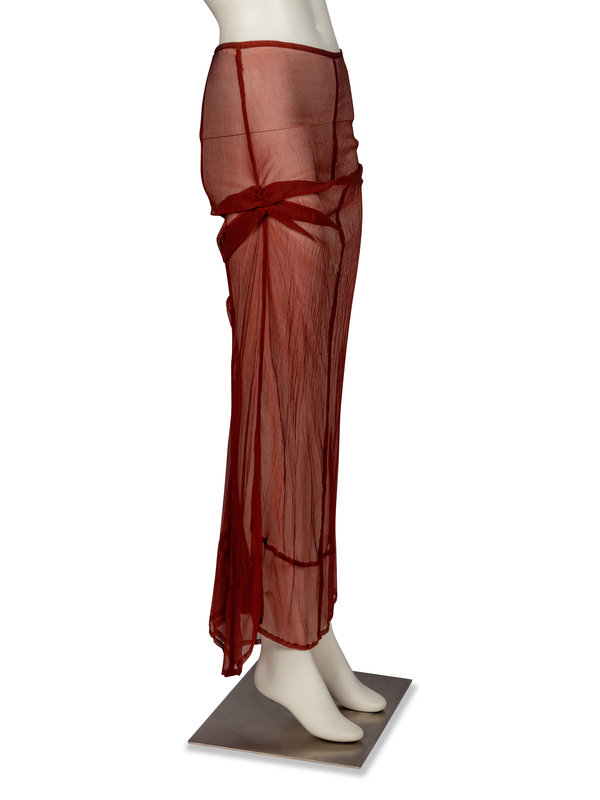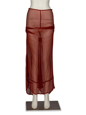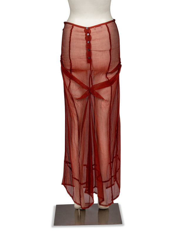 Long skirt in pleated/crinkled silk chiffon with gathering details and button closure at rear. Unlined.