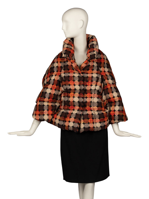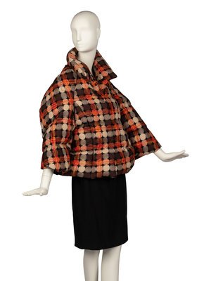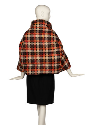 Short, poncho-style down-filled jacket in padded wool blend with a geometric motif jacquard. Jacket features false sleeves and a full lining.