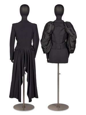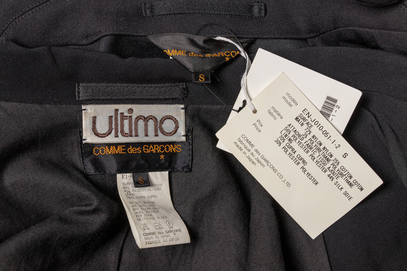 Long, open-front notch collar jacket in black technical weave with flared/pleated skirt. Partially-lined. Fall-Winter 1992.