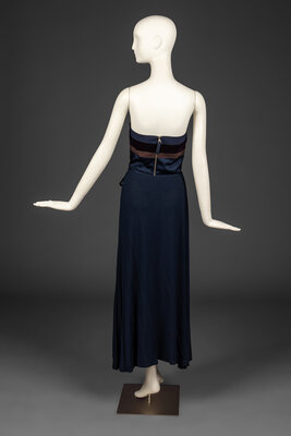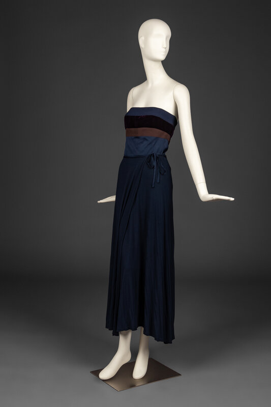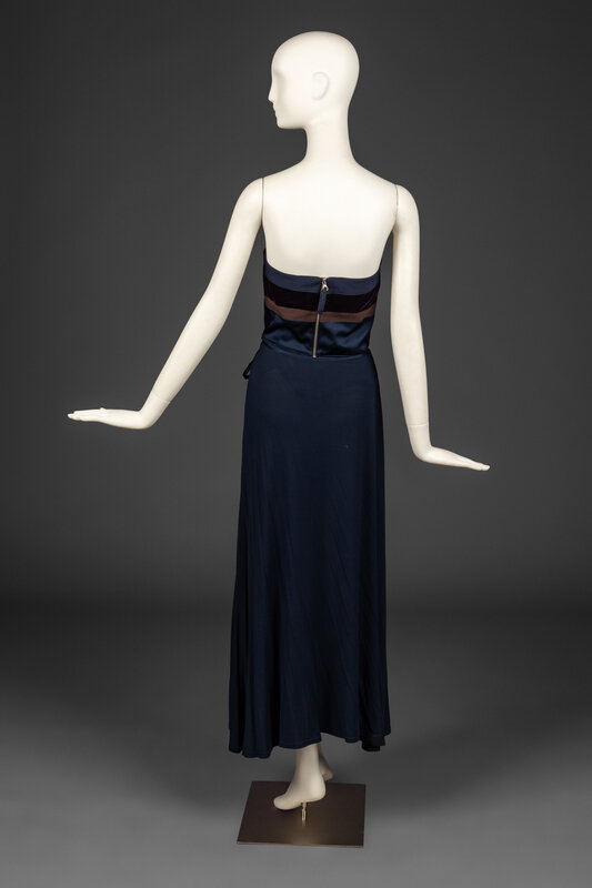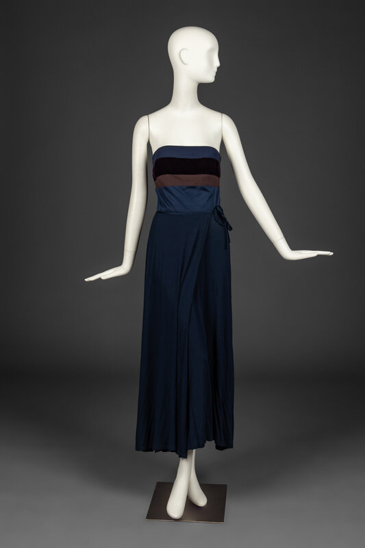 Sleeveless dress in tricolor crepe, velvet, and matte satin. Dress features wrapped skirt and a rear zipper closure. Unlined.