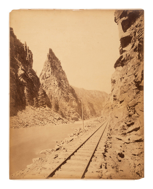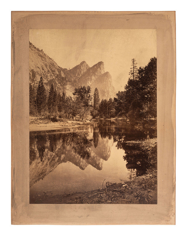 WATKINS, Carleton (1829-1916), photographer. The Three Brothers, reflected, Yosemite, California. Ca 1865. 15 1/2 x 21 in. albumen photograph on 20 x 26 in. cardstock mount (toning and some light soiling to print and mount; some edge wear to mount, small modern sticker affixed to mount verso). -- JACKSON, William Henry (1843-1942), photographer. Currecanti [sic] Needle. Black Canon of the Gunnison. Denver, CO, ca 1870. 16 1/2 x 21 in. albumen photograph on 16 5/8 x 21 1/4 in. cardstock mount (toning to print and mount; mount heavily trimmed, with some loss to corners). -- Together, 2 mammoth plate photographs of California and Colorado.