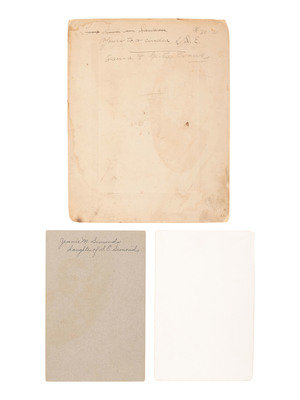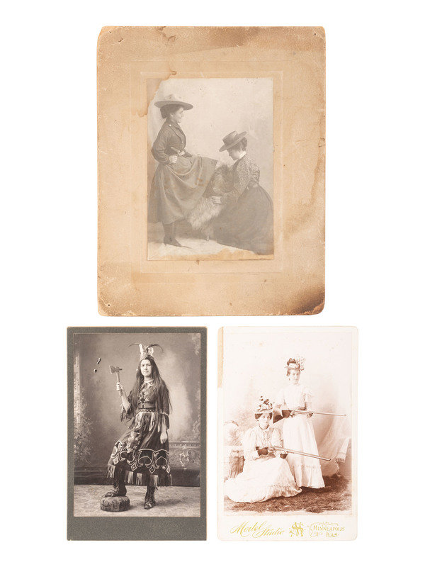 [With:] Cabinet card of a woman wearing a Native American costume with tomahawk in hand, possibly a wild west show performer. Marlboro, MA: Williams, n.d. Inscription on verso identifies the subject as "Jennie M. Simonds, daughter of S.E. Simonds." -- Cabinet card of two women in white dresses and fancy hats, each posed with a rifle in hand. Minneapolis, KS: Model Studio, n.d. (edge wear to mount). -- Cabinet photograph on 7 x 8 3/4 in. mount showing two women wearing wide-brimmed hats (staining to margins of print and mount; corner loss and pinholes in mount). The woman standing at left has a knife tucked in her belt and rests one of her boots on a fur-covered prop. An inscription on verso reads, "Yours to a cinder, L.D.E., Laura & Gertie Evans."
