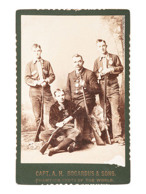 Capt. A.H. Bogardus & Sons. Champion Shots of the World. Uncredited, but likely taken by Eisenmann of New York, ca 1889 (surface loss to lower right corner of print; light edge wear to mount). A cabinet card showing four shooters, Captain A.H. Bogardus (1834-1913) and his sons. Bogardus was one of Buffalo Bill's first trap shooters in the early Wild West shows. It was when Bogardus left in 1855 that Cody, still somewhat skeptical, let Annie Oakley try out for the sharpshooter's position. Most, and especially Bogardus, wear shooting medals; the two older sons with ammunition on their shirts and their belts.