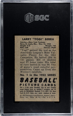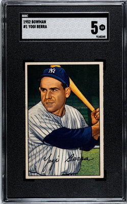 A 1952 Bowman Yogi Berra Baseball Card No. 1 (SGC 5 EX)