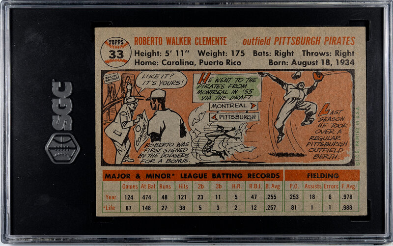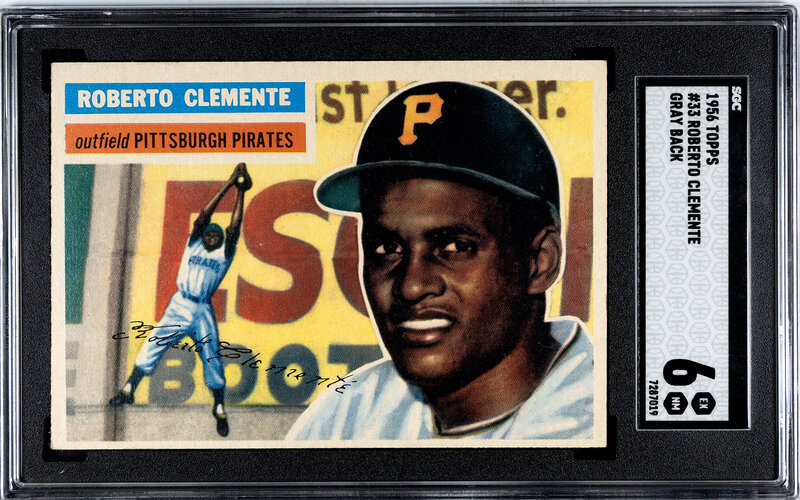 A 1956 Topps Roberto Clemente Gray Back Baseball Card No. 33 (SGC 6 EX/NM)