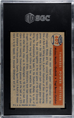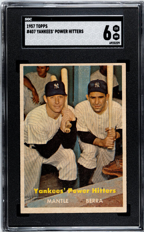 A 1957 Topps Mickey Mantle and Yogi Berra Yankees' Power Hitters Baseball Card No. 407 (SGC 6 EX/NM)