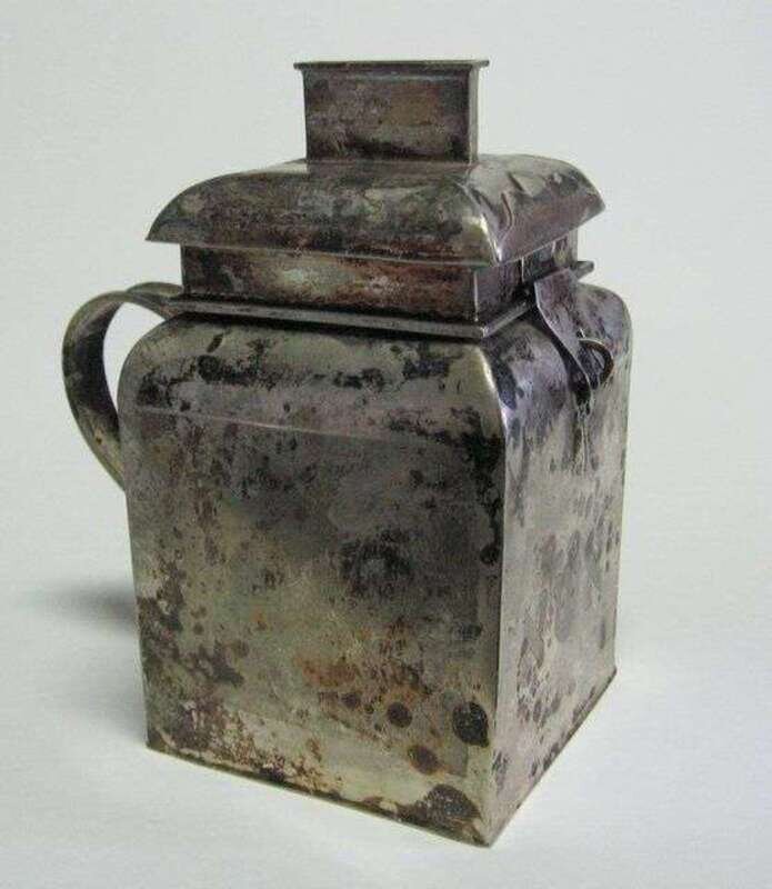 The squared, domed and hinged lid centered by a raised coin slot, over a conforming body with scroll handle, with Hebrew inscriptions to two sides.