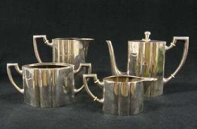 Comprising a teapot, milk pitcher, creamer, and sugar bowl (lacks lid), with fluted oval sides.