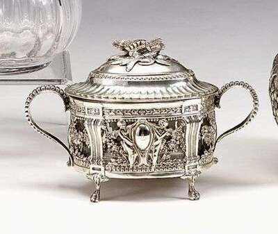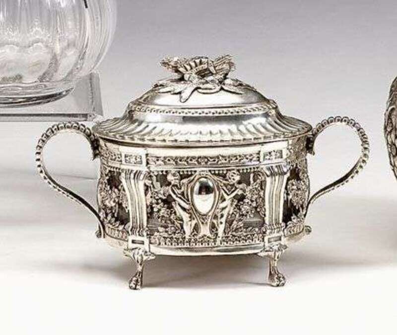 Retailed by G. Bachelet, Paris, the fluted domed lid surmounted by flaming torches, the openwork sides decorated with cherubs and floral swags, raised on four claw feet.