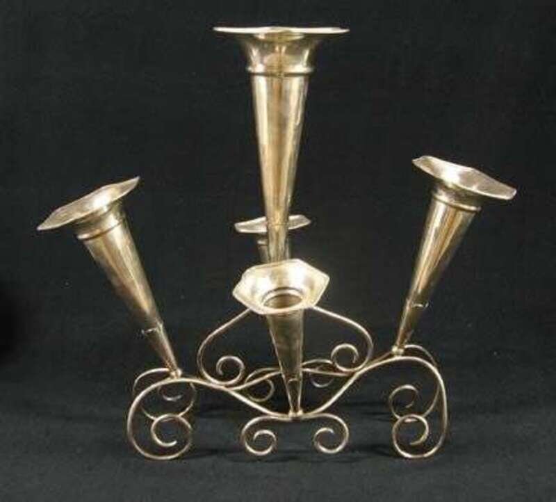 The wirework scroll stand with five trumpet shaped vases.