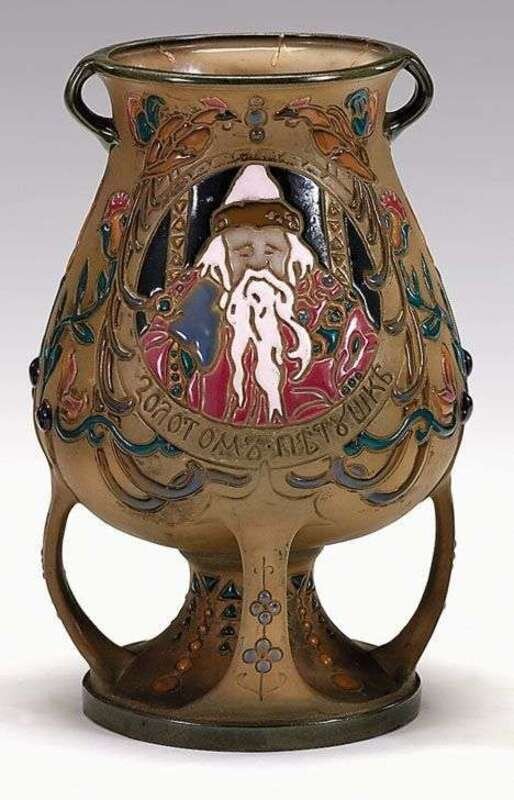Of ovoid form with twin loop handles with four strap supports, with impressed, enameled decoration throughout , the central figural reserve depicting an old man, a rooster verso, with impressed factory marks and number 11874 47.
