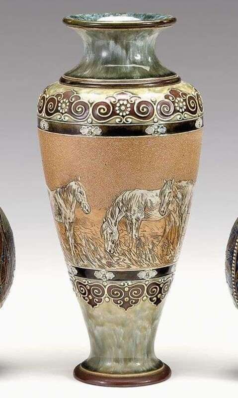 The ovoid sides incised with horses in a landscape, enclosed by stylized plant forms against a mottled green ground, impressed mark and artist monogram.