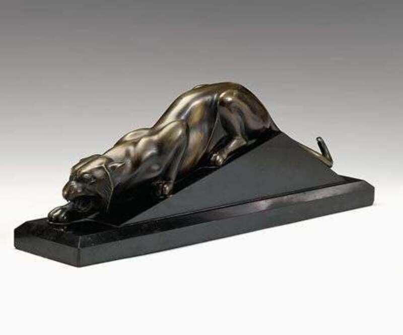 Bronze brown patina, signed G. Lavroff, modeled as a crouching tiger, raised on a black slate base.