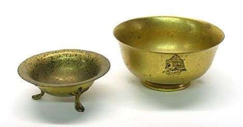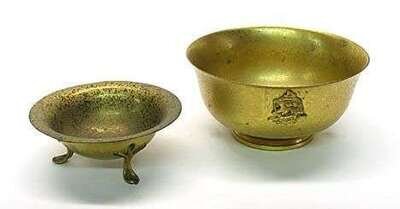 The larger example with a flared circular foot and applied sailing ship motif, the other with a wide flaring rim and raised on tripod legs; both stamped 'Louis C. Tiffany Furnaces Inc./Favrile 406 and 409'. (2).