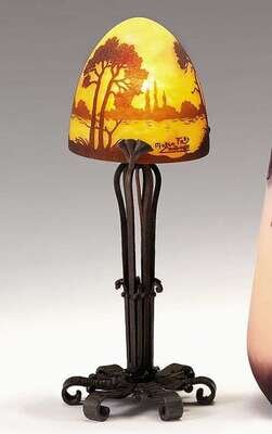 The domed shade decorated with a continuous riverside scene, signed Muller Freres, Luneville, on a wrought iron openwork base in the manner of Edgar Brandt.