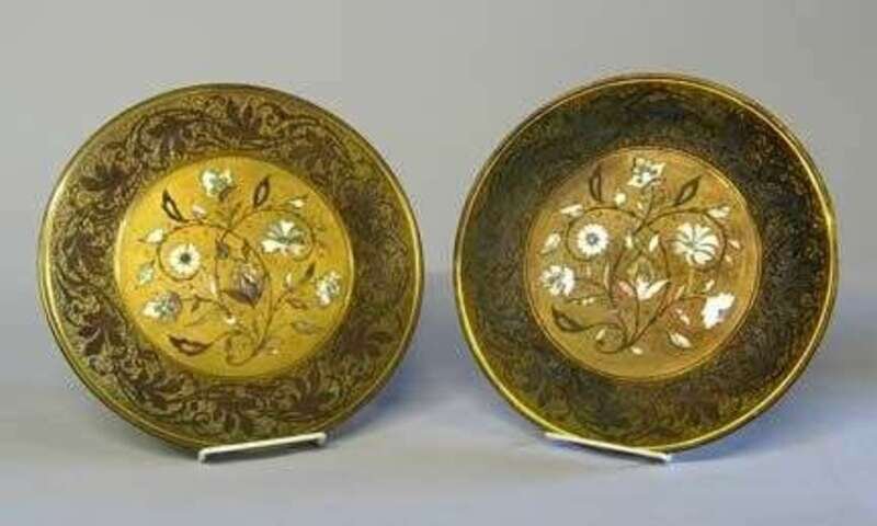 Pair of gilt, patinated bronze and mother-of-pearl inlaid chargers late 19th / early 20th century