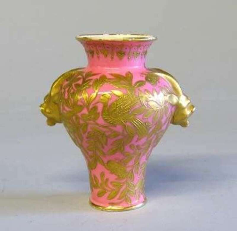 The ovoid sides decorated in gilt with scrolling foliage and exotic birds against a pink ground, printed crown mark.