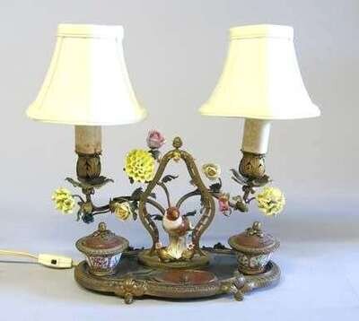 The shaped base with two porcelain covered wells, centered by an associated Meissen figure of a bird, from which issue two outscrolling candelabra applied with flowers.
