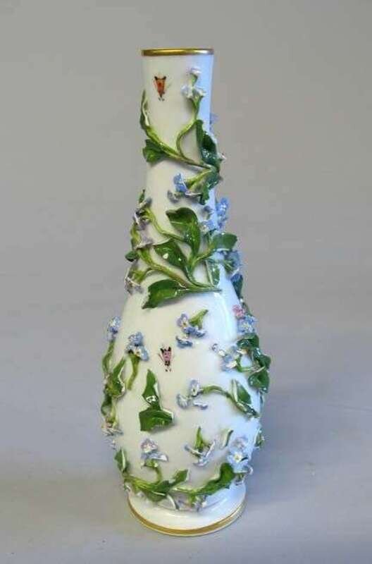 Of bottle form, the sides applied with flowering leaves, against a white ground painted with insects, blue crossed sword mark.