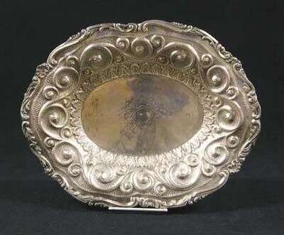 The oval sides embossed with scrolls and acanthus, within a shell and scroll cast rim.