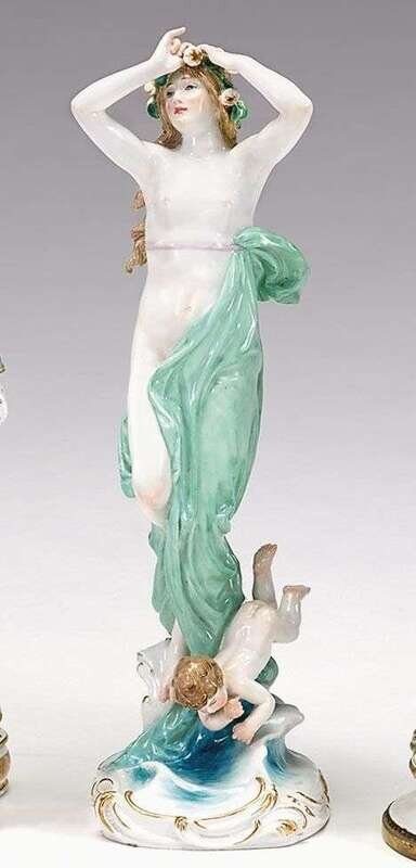 Modeled as the draped semi-nude standing figure with a floral wreath in her flowing blonde hair, with a cherub at her feet, blue crossed sword mark, bears paper 'M. Munk, Wein, I, Graben 12'.