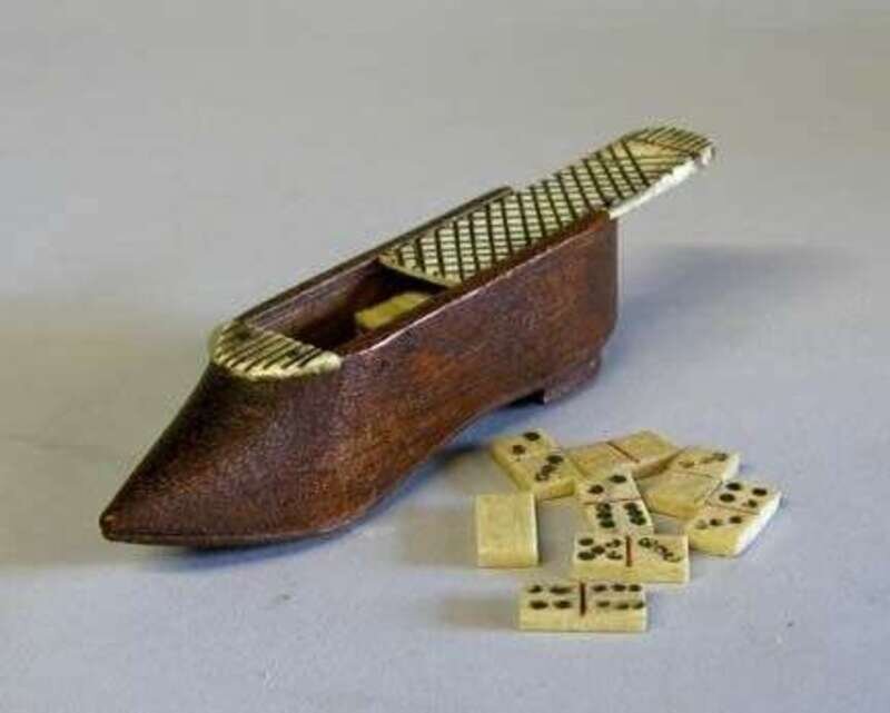 The case in the form of a shoe, the sliding cover enclosing a set of ivory dominos.