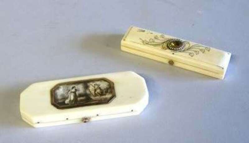 Of canted rectangular form, the hinged lid centered by a grisaille painted panel depicting classical figures in a wooded landscape; together with a small ivory and pique box, set with semi precious stones and seed pearls. (2).