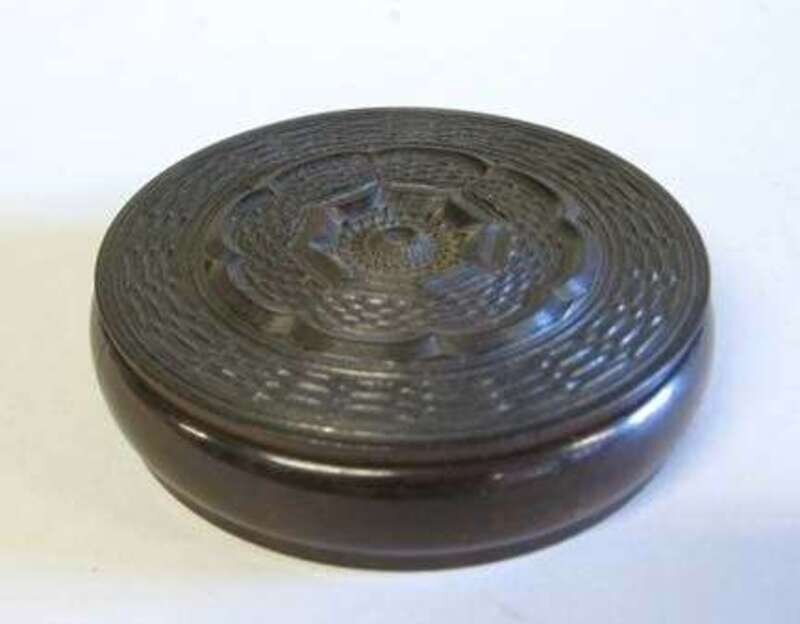 The lid and underside carved with geometric bands and stylized flower head motifs.
