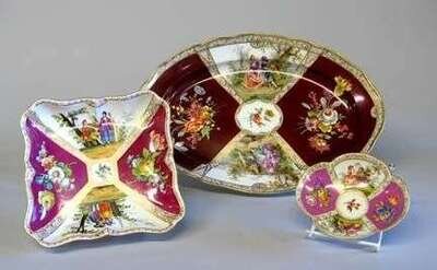 Painted with two reserves depicting romantic scenes of courting couples against a red ground decorated with flower sprays, blue crossed sword mark. W: 16 in; together with similar Meissen square dish and a small Dresden porcelain saucer. (3).