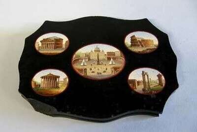 The cartouche shaped plaque inlaid with five oval reserves depicting, St. Peters Basilica, the Colosseum, the Temple Apollo, the Pantheon and the Round Temple at Forum Boarium.