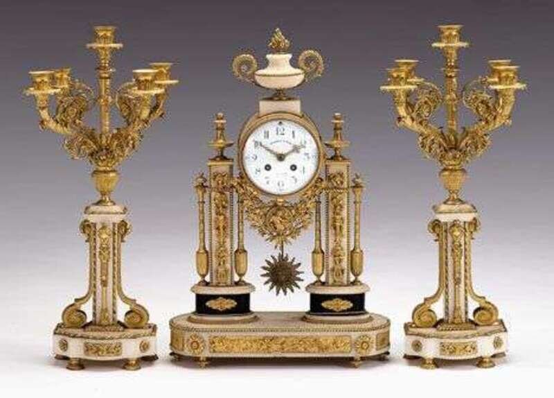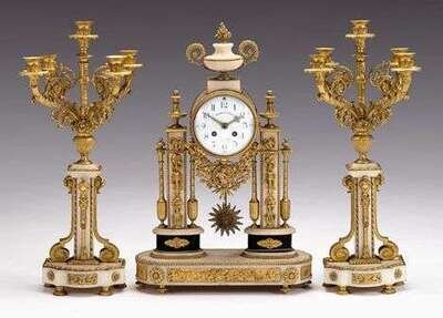 Louis XVI style gilt bronze mounted alabaster assembled clock garniture 19th century