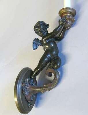 The oval back plate with an out-scrolling branch surmounted by a winged cherub holding aloft a candle nozzle.