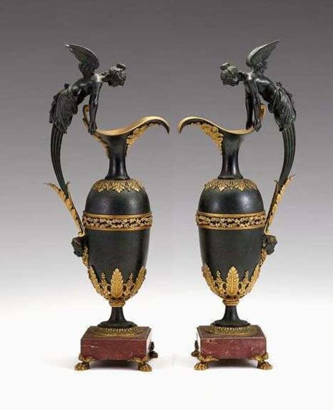 Pair of French Neo-classical style patinated and gilt bronze ewers late 19th century