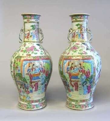 Decorated in the typical palette, the ovoid sides painted with two figural reserves depicting courtiers.