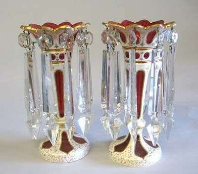 The domed circular base and trumpet shaped stem enriched with gilt and hung with prism shaped drops.